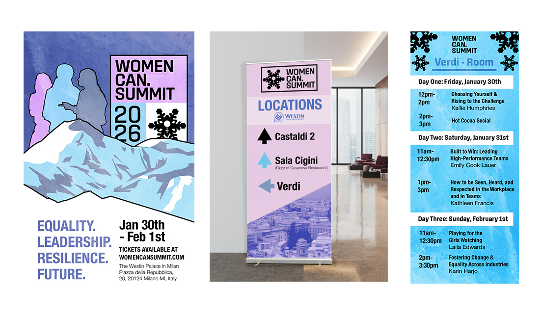 This branding project was completed as part of a three-person collaboration in my Branding and Storytelling class. Our team developed a conference focused on women in winter sports, highlighting resilience in athletics and professional careers. The event is set in Milan, Italy, the weekend before the 2026 Winter Olympics to attract athletes and visitors.