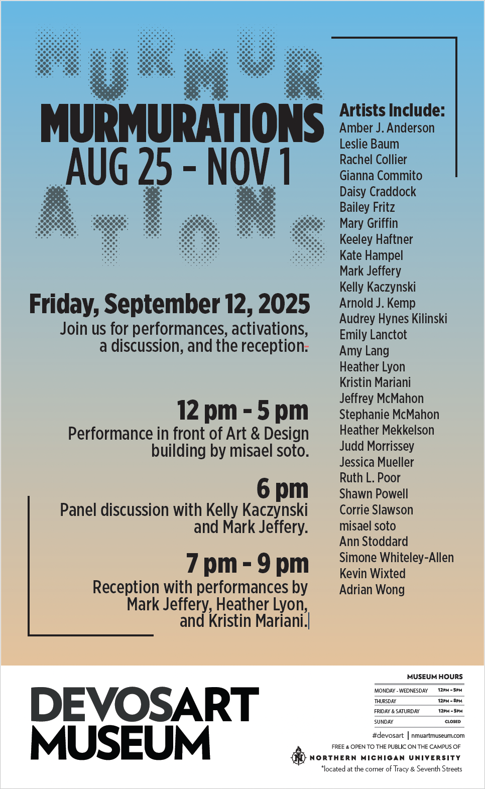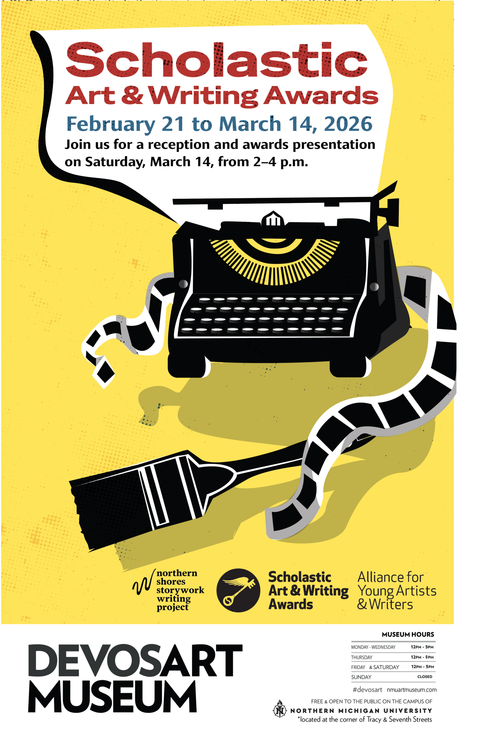 As a graphic design Intern, I create graphic materials for events and exhibitions at the DeVos Art Museum here on Northern Michigan’s Campus. For most exhibitions I am tasked to create postcards, posters, and ads. Yearly, we have about eight to ten exhibitions, so its a great way to challenge my different skillsets in adobe illustrator and photoshop to create materials for the museum.